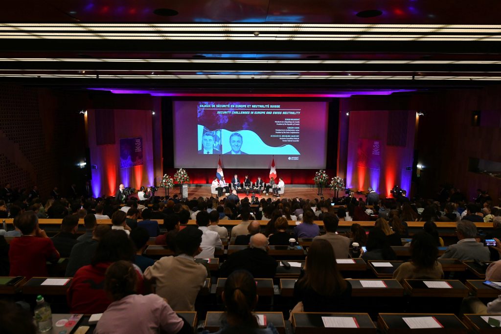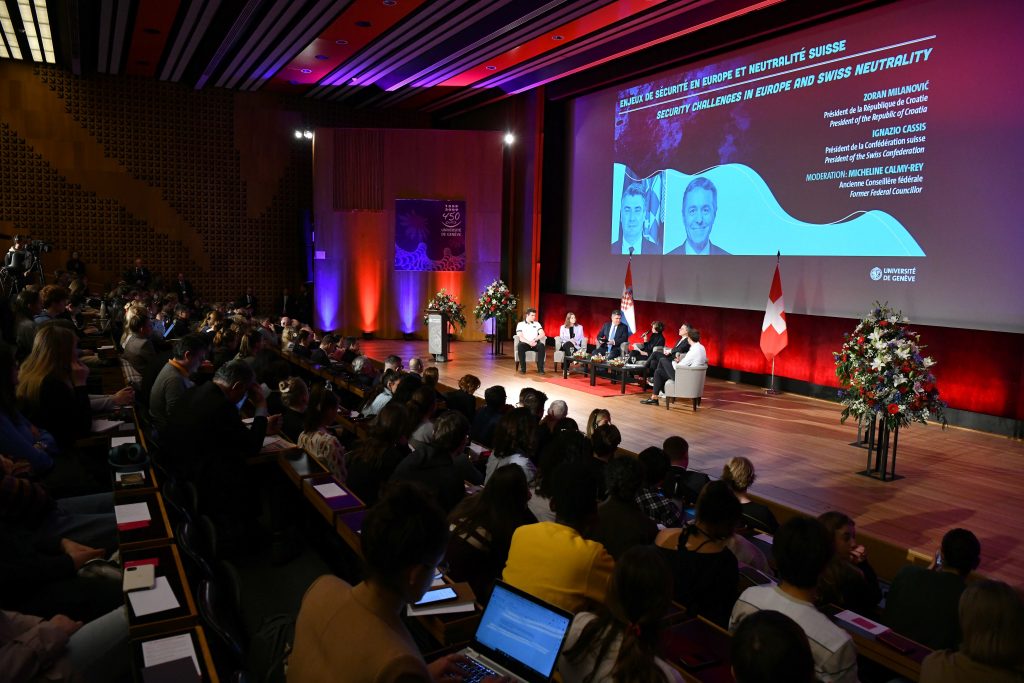 In the continuation of the day, the two presidents visited the University of Geneva where they took part in a panel entitled: “Security challenges in Europe and Swiss neutrality“. The moderator of the panel was Micheline Calmy-Rey, former President of the Swiss Confederation and professor at the University of Geneva. Presidents Milanović and Cassis answered questions from the students.