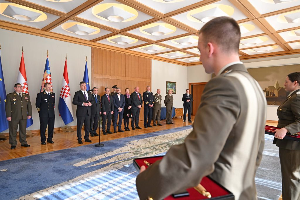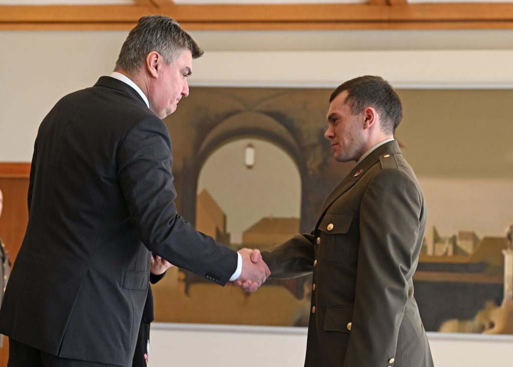 Ranks, officer’s daggers, certificates and credentials certifying the completion of the first officer training level were presented to the graduates by President Milanović, the Chief of the General Staff of the Croatian Armed Forces Admiral Robert Hranj and the Deputy Commander of the Dr. Franjo Tuđman Croatian Defence Academy Brigadier General Blaž Beretin. The ceremony was also attended by the Commander of Support Command Lieutenant General Mladen Fuzul, Assistant Chief of the General Staff of the Croatian Armed Forces for Health Major General Boris Zdilar, Head of the Petar Zrinski Military Schools Centre Colonel Damir Stručić and the Commander of the Andrija Matijaš Pauk Officers’ School Colonel Mirko Stošić.