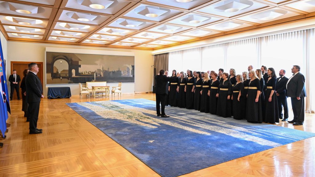 Besides choir director, Ozren Bogdanović, and Society president, Davor Konfic, attending the meeting in the Office of the President of the Republic were Society members: Dunja Miklečić, Vesna Sokač, Marija Dimjašević, Petra Siladi Varović, Saša Komarica, Božo Zlatar, Mirela Rajniš, Kristina Višak, Klara Španić, Sanja Kemenović, Martina Krnjić, Stojan Miščević, Lovro Baričević, Tea Šatrak, Gordana Koščak, Hrvoje Seleš, Jasna Kadoić, Ksenija Maričić, Renata Jajčanin, Josip Šatrak, Martina Valec-Rebić, Ante Živković, Ivan Car, Mihael Rebić, Irena Horvat, Rajka Bajsić-Tepeš, Jelena Vanjhard and Jagoda Hrandek-Ilijevski.
