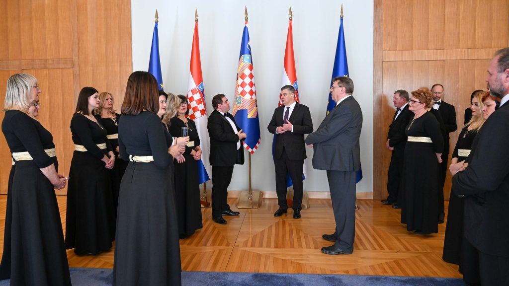 The President of the Republic Zoran Milanović received today members of “Kalnik“ Croatian Singing Society from Križevci on the occasion of their 125th anniversary. The president of “Kalnik“ Croatian Singing Society, Davor Konfic, and choir director, Ozren Bogdanović, presented their choir to President Milanović which, with brief interruptions, has been successfully in operation since 1900. This year, the choir is marking 125 years of work. Also this year, Križevci is celebrating 160 years of uninterrupted organized choral singing thanks to the singing societies that operated before and during the time of “Kalnik” Croatian Singing Society.
