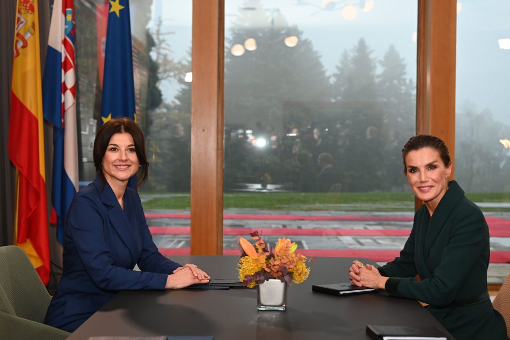 The wife of the President of the Republic of Croatia Prof. Sanja Musić Milanović, Ph. D., and Her Majesty Letizia, the Queen of Spain, discussed at a working meeting held today at the Office of the President innovative approaches to preventing childhood obesity. Her Majesty Letizia, the Queen of Spain, is on a visit to Zagreb as part of an official visit to the Republic of Croatia together with His Majesty Felipe VI, the King of Spain.